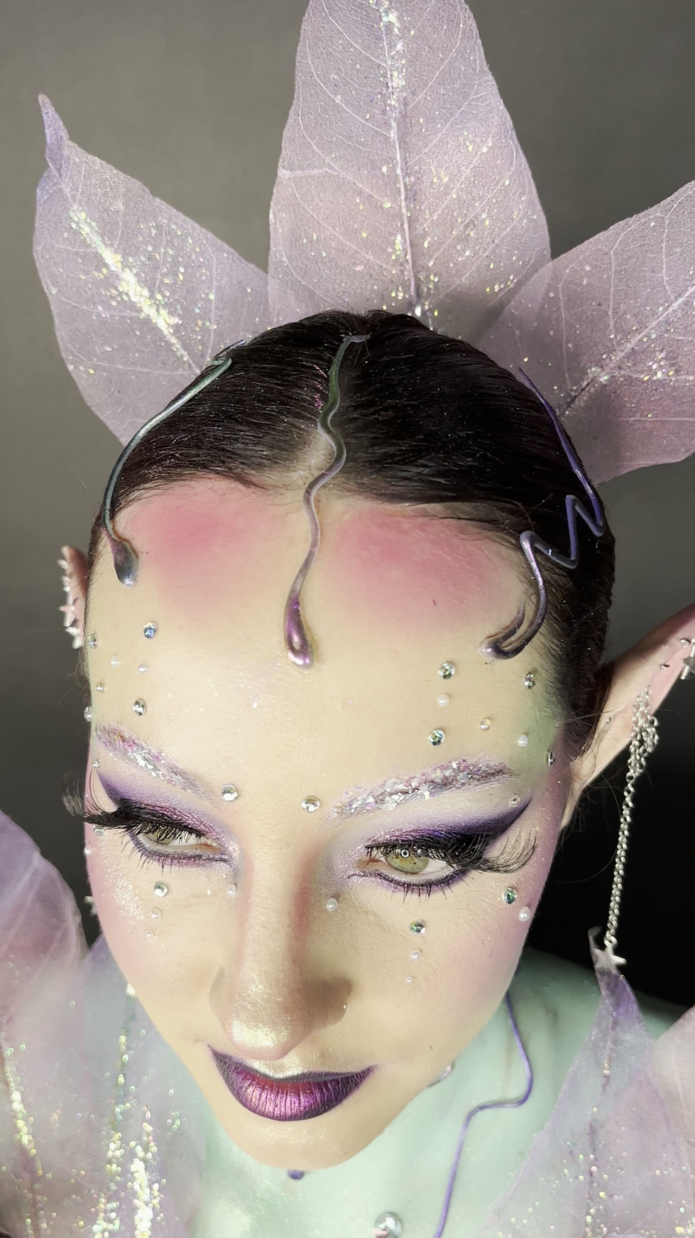 Cette création donne vie à une figure féerique mêlant textures organiques, couleurs lumineuses et détails scintillants. Prothèses en mousse de latex, strass, feuilles artificielles et lignes en colle chaude s’intègrent au bodypainting pour transformer le corps en personnage hybride, délicat et mystique.